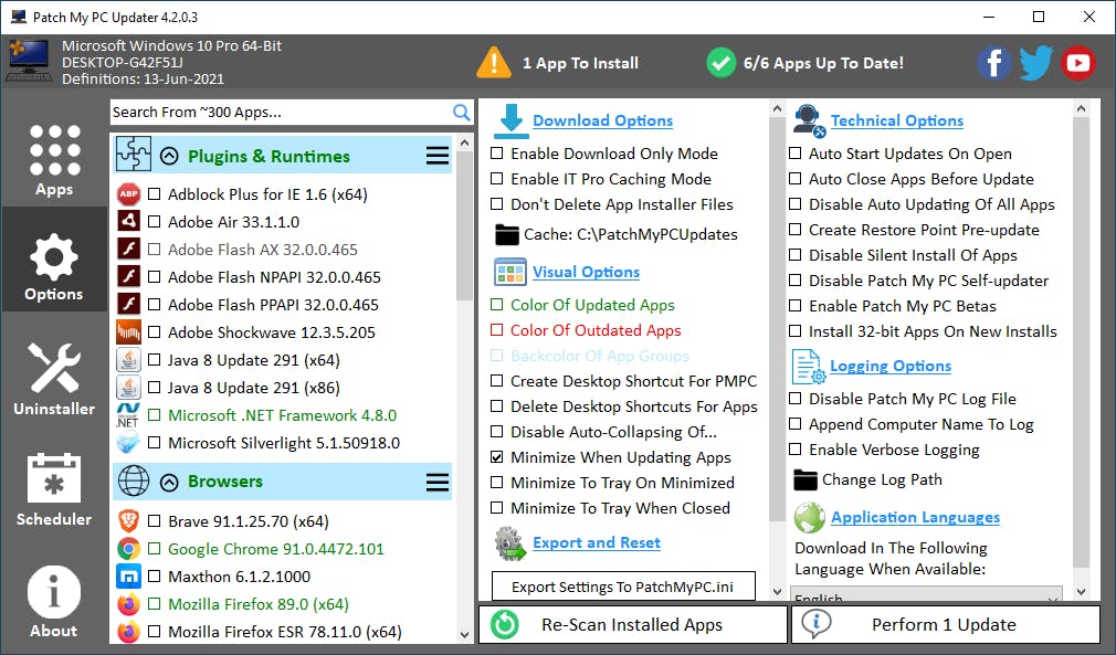 Software is inmiddels vaak beschikbaar in een 32-bit en 64-bit uitvoering. Patch My PC Updater installeert automatisch de variant die het meest geschikt is voor de gebruikte computer, maar je kunt er ook voor kiezen om altijd de 32-bit uitvoering te installeren. Dit is bijvoorbeeld handig als een programma uitgebreidere plug-ins heeft voor de 32-bit versie. In de sectie Options kies je bij Technical Options voor de instelling Install 32-bit Apps On New Installs. Ook kun je afdwingen dat er altijd voor de Nederlandse (of Engelse) versie wordt gekozen. Bij Application Languages kies je in het menu voor English of Dutch.