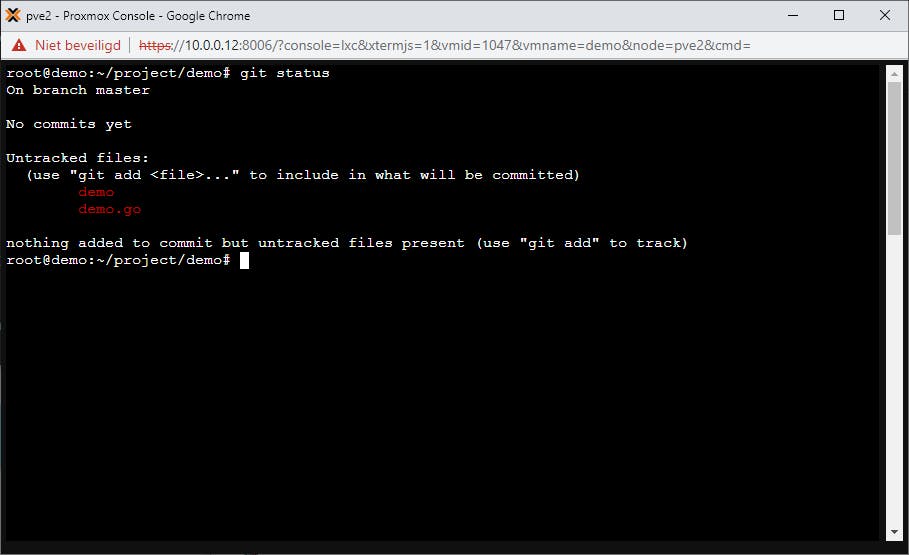 Geef je via de opdrachtregel de opdracht git status, dan zie je dat je in de branch met de naam master werkt en dat de bestanden die Git in de map heeft gevonden als Untracked zijn aangemerkt (demo.go en het uitvoerbare bestand demo of demo.exe). Dat houdt in dat Git ze niet volgt op dit moment en er dus geen wijzigingen voor bijhoudt. Dat gebeurt pas als je ze toevoegt aan de zogeheten staging area, een soort tijdelijke buffer, en van daaruit naar de repository. Om het bestand in de staging area te zetten geef je de opdracht: