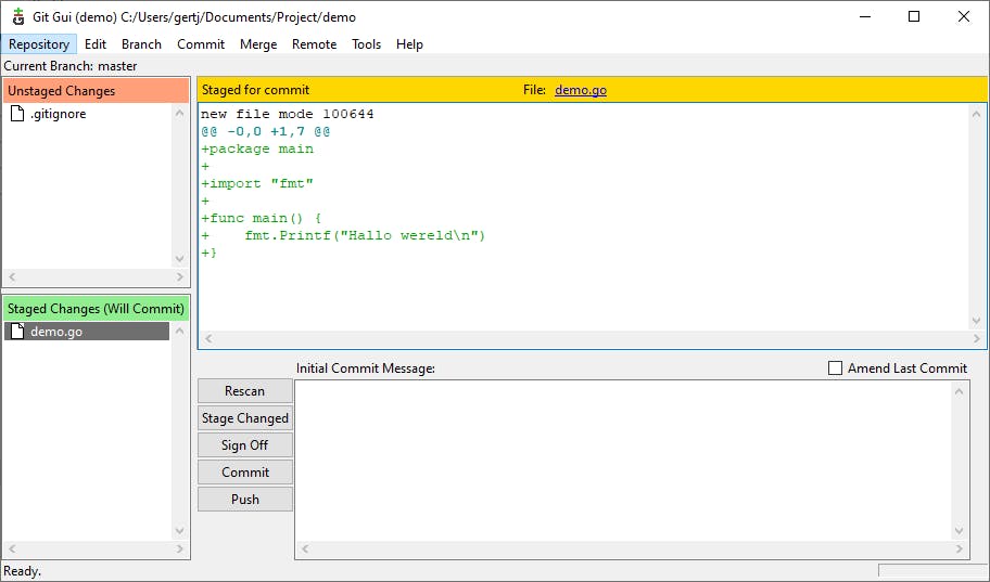 Voordat je wijzigingen door Git laat volgen, is het goed te bedenken voor welke bestanden dat nodig is. In dit voorbeeld is eigenlijk alleen demo.go relevant, omdat het uitvoerbare bestand (demo of, onder Windows, demo.exe) altijd opnieuw gecompileerd kan worden voor het platform waarop het wordt gebruikt. Doorgaans zul je ook geen logbestanden tracken of configuratiebestanden met gevoelige wachtwoorden. Je kunt natuurlijk wel een leeg configuratiebestand in de repository opnemen dat als voorbeeld dient, zodat de gebruiker alleen de parameters voor zijn situatie hoeft aan te vullen.