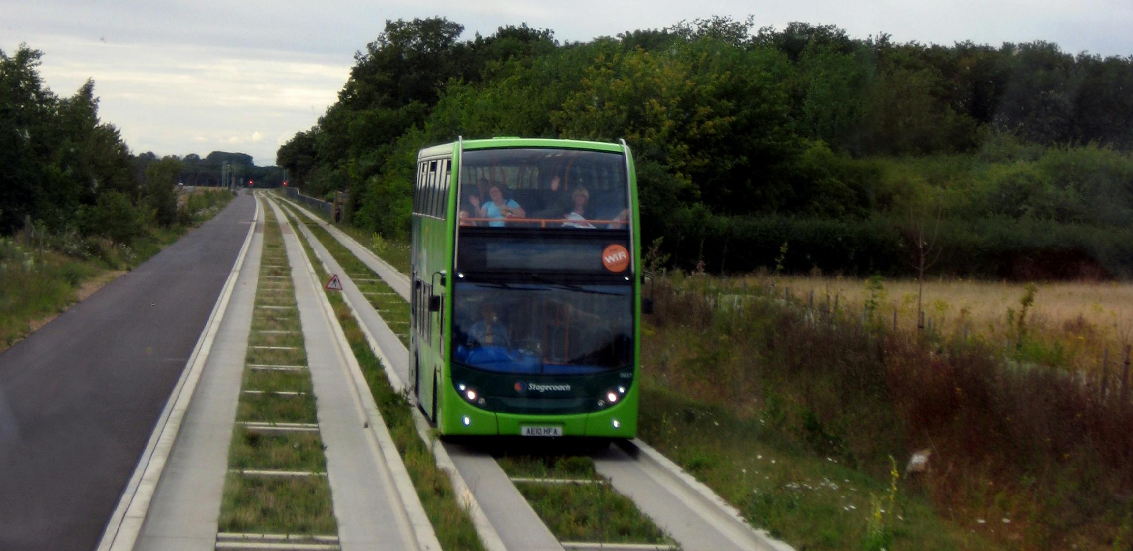 Een andere ontwikkeling op het gebied van (deels geautomatiseerd) busvervoer is de zogeheten geleidebusbaan. Al in de jaren zeventig werd in de Duitse stad Essen een grote proef gedaan met een betonnen busbaan, waar bussen werden geleid door middel van een verhoogde rand. Zijwielen op de bussen zorgden ervoor dat de bus zijn baan bleef volgen.