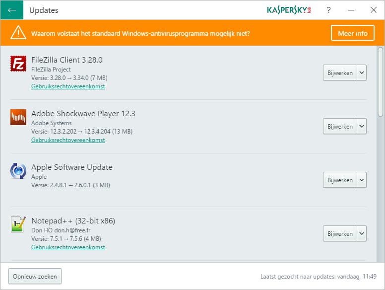 Kaspersky is vooral bekend als producent van antivirusproducten, en het verbaast ons dan ook niet dat het ook een software-updater heeft uitgebracht: immers, up-to-date software maakt het ook malware lastiger. Na een druk op de knop scant de tool de pc op mogelijke updates. Het resultaat is een lijst van programma’s die aan een update toe zijn. De tool laat niet zien welke andere toepassingen (die blijkbaar wel up-to-date zijn) het heeft gedetecteerd. Je kunt de lijst ook niet op een of andere manier sorteren, om bijvoorbeeld de oudste programma’s bovenaan te zetten.