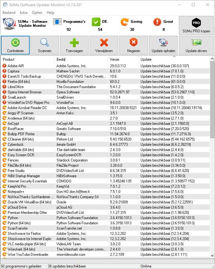 Het grootste manco bij de gratis versie is in elk geval de onmogelijkheid om programma’s vanuit de tool zelf te updaten. Je komt hier dus alleen te weten welke toepassingen aan welke update toe zijn, maar daar blijft het ook bij. De Pro-versie voegt daar weliswaar downloadlinks aan toe maar je moet de updates dan nog altijd zelf downloaden en installeren. Automatische of stille batchupdates zitten er dus ook in de Pro-versie niet bij.