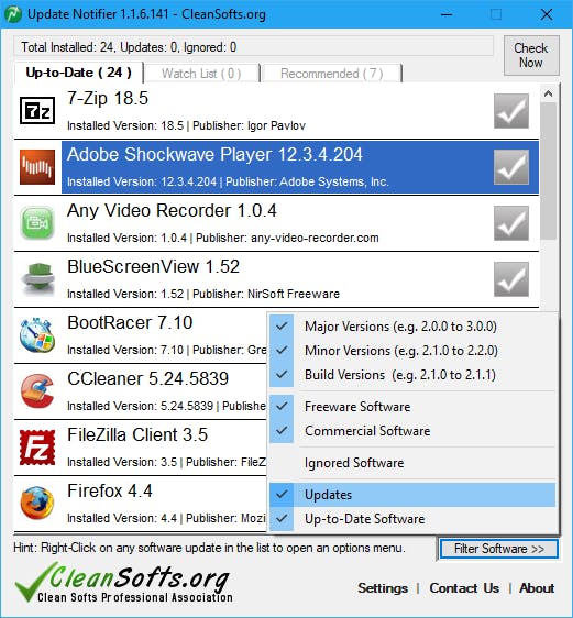 Een pluspunt is alvast wel dat de lijst zich makkelijk laat filteren, zodat je bijvoorbeeld alleen programma’s ziet waarvoor een update beschikbaar is. Je kunt hierbij ook een onderscheid maken tussen grote, kleine en (nog kleinere) build-updates. Het is tevens mogelijk bepaalde programma’s aan een ignore-lijst toe te voegen zodat je hiervan niet langer een melding krijgt dat er een update beschikbaar is. Update Notifier kan automatisch mee met Windows opstarten en kun je op gezette tijden een scan laten uitvoeren.