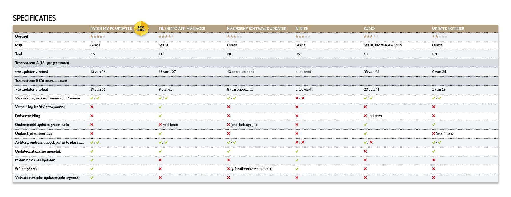 Hierbij moeten we wel als kanttekening geven dat er geen enkele tool uitblinkt in alles wat een software-updater hoort te kenmerken: grondige detectie van (verouderde) programma’s, gecombineerd met (indien de gebruiker dat tenminste zo verkiest) volautomatische en stille updatefunctionaliteit, waarbij de tool ook nog eens netjes de gekozen taal van de geüpdatete programma’s weet te behouden. Het pakket dat aan al deze criteria voldoet, zien we graag verschijnen!