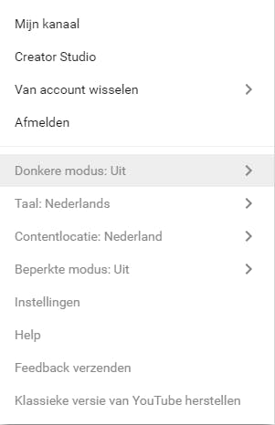 Klik hierop om de Donkdere modus te activeren. YouTube zal de witte achtergrondkleur van de website vervangen met zwart. Dit is vooral prettig als je vaak 's avonds YouTube gebruikt.