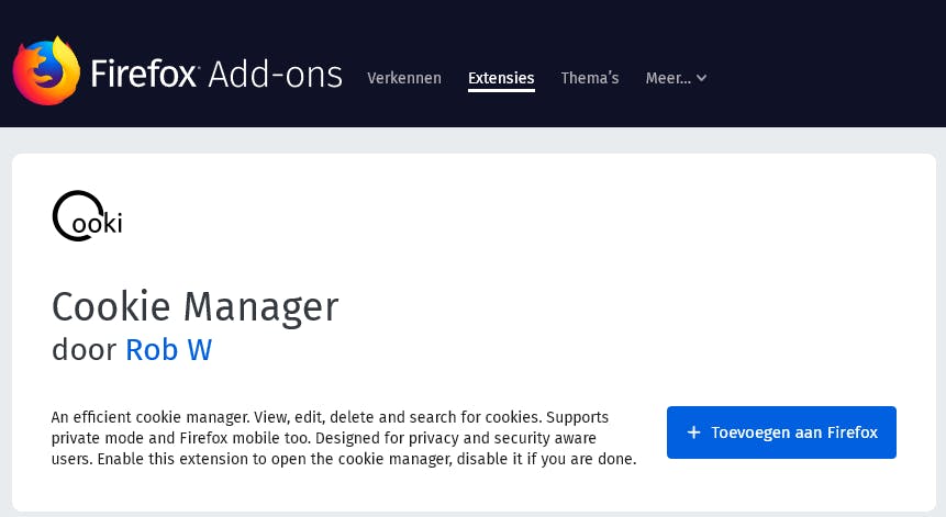 Cookie Manager is zowel bedoeld voor de specialist die cookies wil aanpassen, als voor de thuisgebruiker die zijn verzameling Firefox-cookies selectief wil beheren. Klik op de blauwe knop Toevoegen aan Firefox en bevestig de toevoeging. Voortaan heeft Firefox een nieuwe knop in het menu rechtsboven om deze toevoeging te openen. Mocht deze gratis extensie je niet bevallen, dan kun je hem heel makkelijk verwijderen: klik op de menu-knop in de rechterbovenhoek, ga naar Add-ons. Vervolgens krijg je een lijstje van geïnstalleerde uitbreidingen waarnaast telkens de knoppen staan om de add-on tijdelijk uit te schakelen of definitief te verwijderen.