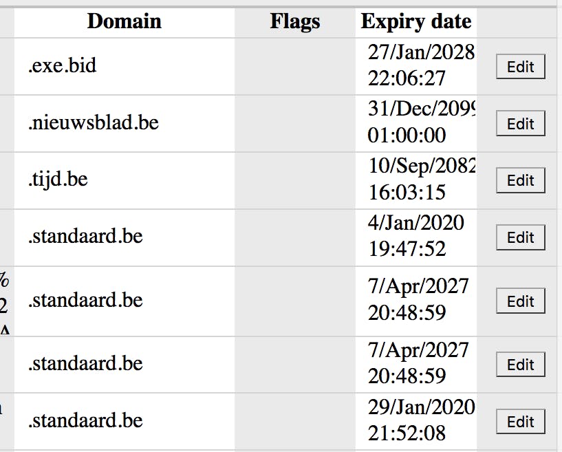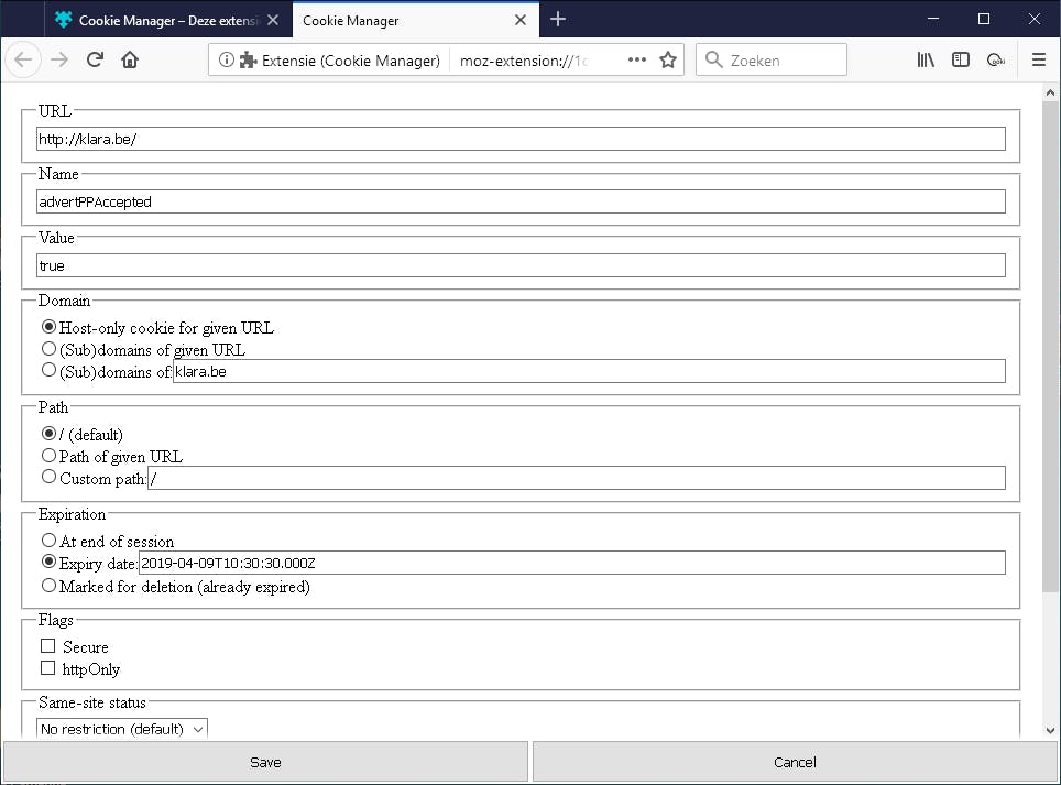 Klik je op de Cookie Manager-knop die nu rechtsboven in Firefox is verschenen, dan kun je Cookie Manager op twee manieren openen. Dat kan allereerst op de algemene pagina die ook verscheen na het toevoegen van de Add-on (via Open Cookie Manager). Je kunt ook kiezen voor Open Cookie Manager for current page, waarna je de lijst krijgt van alle cookies die je hebt ingeladen van deze webpagina. De cookies verschijnen in rijen en in vijf kolommen: Name, Value, Domain, Flags en Expiry Date. Logisch dat in de weergave Current page in de kolom Domain overal dezelfde domeinnaam staat. Als in de lijst bij sommige cookies de Expiry date in het rood staat, betekent dit dat vervaldatum van deze cookies overschreden is.