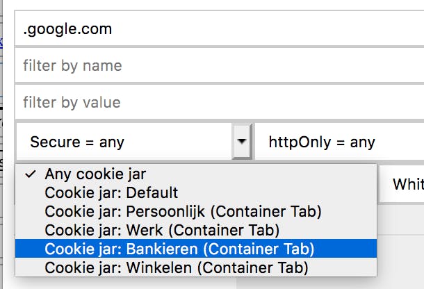 Vroeger werkten de meeste websites met http, tegenwoordig is het veilige https de standaard. In het vak Secure staan drie opties any, secure=yes en secure=no. Door de optie secure=yes in te stellen filter je op cookies die alleen zichtbaar zijn in https en niet in http. Daarachter staat het filter httpOnly=any, =yes, =no. httpOnly=yes zorgt dan weer dat de cookies alleen zichtbaar zijn voor http en niet voor javascript. In het filter Cookie jar vind je de namen van de containertabs die je hebt ingesteld in Firefox. Firefox-containerstabs zijn vergelijkbaar met profielen, zodat je diverse activiteiten in dezelfde browser op je computer gescheiden kunt houden. Je komt in de container via Bestand / Nieuw containertabblad. Met Cookie Manager kunt je dus zoeken naar cookies binnen een bepaalde container.
