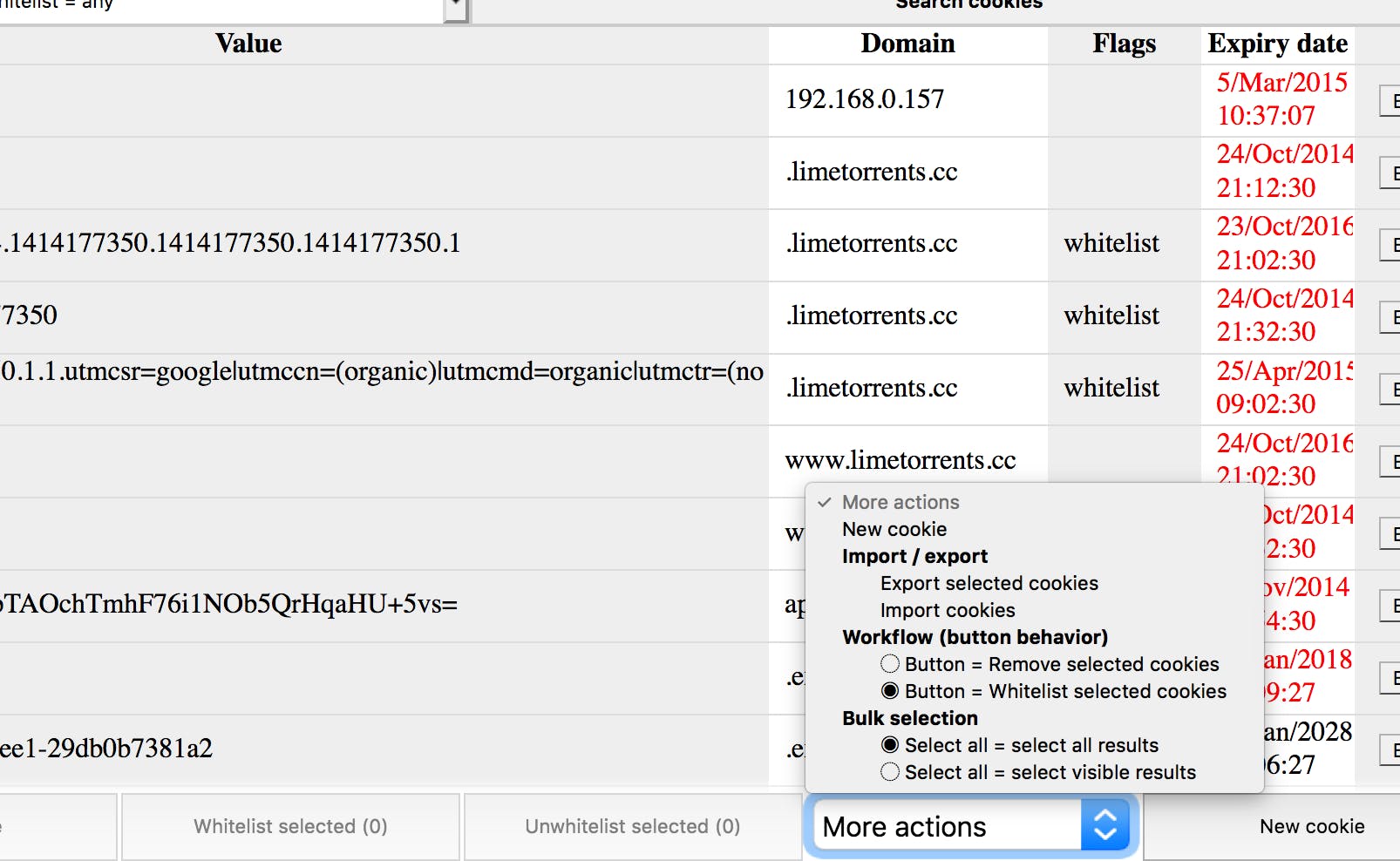 Het is mogelijk om een whitelist aan te leggen met Cookie Manager. Daarvoor moet je eerst naar de knop More actions en daar selecteer je de optie Button = whitelist selected cookies. Vervolgens zoek of filter je het resultaat tot je de cookies hebt die je op de eigen whitelist wilt plaatsen. Selecteer de gewenste cookies zodat de rijen geel worden en klik op de knop Whitelist selected. Hierdoor verschijnt bij de geselecteerde cookies in de kolom Flags de extensie whitelist. Hierna kun je het filtervak Whitelist any / yes /no gebruiken om de cookies te vinden die wel en niet op de whitelist voorkomen.