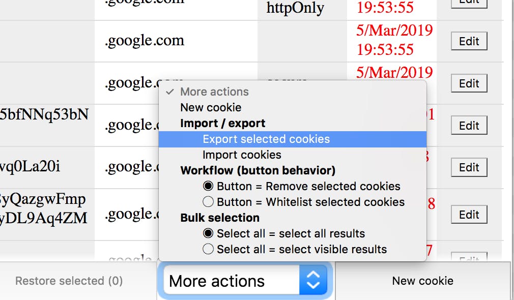 Je kunt hiervoor de cookies van die domeinen exporteren op computer A en daarna importeren op machine B. Eerst maak je in Cookie Manager een selectie van cookies die je wilt overdragen. Dan ga je via de knop More actions naar de opdracht Export selected cookies. Op de nieuwe machine moet je uiteraard ook Cookie Manager installeren zodat je via More actions en Import selected cookies deze cookies inlaadt.