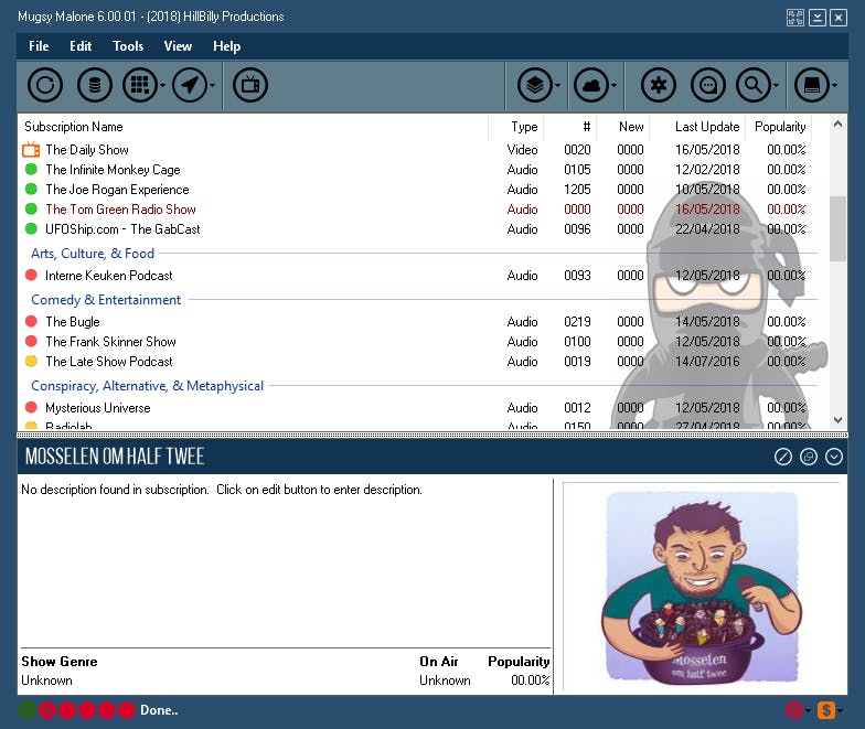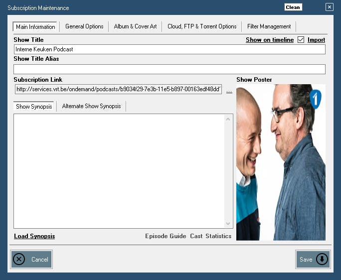 Uiteraard zijn er in Nederland en Vlaanderen shows die niet in de standaardlijst staan. We nemen even de favoriete podcast van de auteur van dit stuk: ‘Interne keuken’. Om zo’n podcast aan Shinobi toe te voegen, klik je bovenaan op Tools / Subscriptions / Subscription Manager. In deze manager kun je de podcasts die je niet interesseren verwijderen met de minknop. Om een nieuwe podcast toe te voegen, klik je op de plusknop, waarna je het internetadres van de show invoert. Klik op Go en vervolgens kun je de informatie over de podcast aanpassen. Op dat moment zullen er nog geen afleveringen van deze podcast in Shinobi staan. Daar komt verandering in als je bovenaan het tweede icoon klikt: Update and refresh cache.