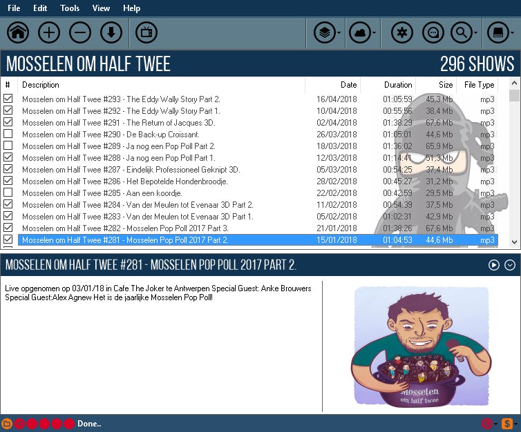 Dubbelklik op de podcast die je wilt horen. Bekijk de lijst uitzendingen en kies welke aflevering je wilt downloaden. Het is mogelijk verschillende of zelfs alle afleveringen aan te vinken. Omdat zo’n lijst soms erg lang is, beschik je over een plusknop om alles te selecteren en een minknop om alles te deselecteren. Heb je een keuze gemaakt, dan gebruik je het pijltje dat naar beneden wijst om de geselecteerde bestanden te downloaden. Hierdoor opent zich de Downloadmanager. Klik daar bovenaan op Tools en dan op Start. Wanneer je met de rechtermuisknop op het bestand klikt, kom je bij de opdracht Open Destination Folder om het bestand te openen.