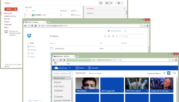 In dit artikel nemen we de diensten van Dropbox, Microsoft, Google en Facebook als voorbeeld. Als het om opslag gaat, zijn er drie grote spelers: Microsoft OneDrive (voorheen SkyDrive), Dropbox en Google Drive. Vooral Google en Microsoft werken met gekoppelde diensten waardoor de beveiliging hier zeer belangrijk is. Heb je bijvoorbeeld een Android-toestel, dan is de kans groot dat veel persoonlijke gegevens via je Google-account worden opgeslagen.