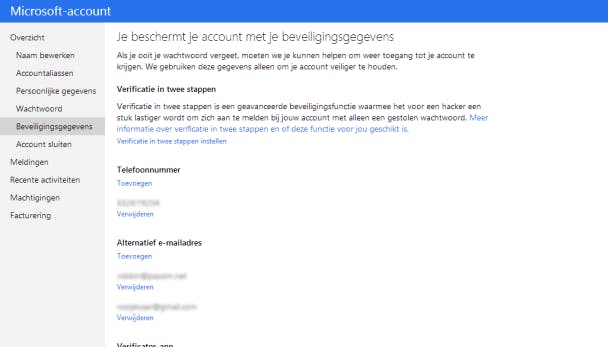 De opties om je Microsoft-account te beveiligen vind je hier, ga naar Overzicht / Beveiligingsgegevens om een telefoonnummer en alternatief mailadres in te stellen. Ook kun je een speciale app voor je smartphone downloaden om je account te beveiligen.