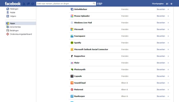 Klik rechtsboven in je Facebook op het tandwiel-icoontje en kies Instellingen. Bij Beveiliging / Herkende apparaten en bij Actieve sessies zie je vanaf welke computers/apparaten je Facebook wordt gebruikt. Met Bewerken kun je de rechten intrekken. Klik in de linkerkolom op Apps om te zien welke apps je met je Facebook-account gebruikt. Ook hier kun je de rechten eenvoudig intrekken of beperken. Standaard toont Facebook een beperkte lijst. Klik op Alle apps weergeven voor een compleet overzicht.
