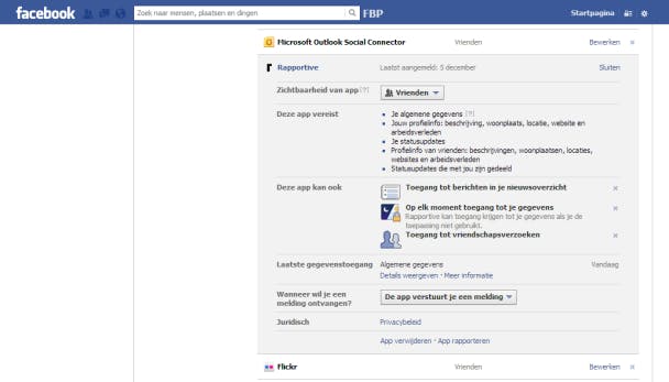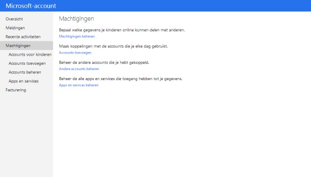 Surf naar deze website en ga naar Machtigingen. Bij Beheer de andere accounts die je hebt gekoppeld staan de koppelingen met andere accounts die je via het Microsoft-account gebruikt, bijvoorbeeld Facebook en Flickr. Bij Beheer alle apps en services die toegang hebben tot je gegevens vind je de diensten die je toegang hebt gegeven tot het Microsoft-account.