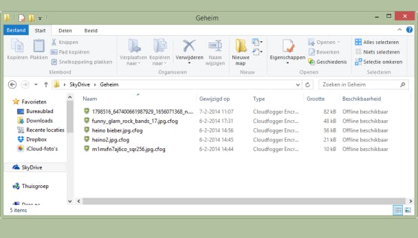 Maak bijvoorbeeld de map Geheim aan in je Dropbox en kopieer hier meerdere bestanden naartoe. Je merkt dat de inhoud van de map onleesbaar wordt als Cloudfogger niet actief is (of als je niet bent aangemeld). Neem bijvoorbeeld de proef op de som door de inhoud van de map Geheim op te vragen via de website van Dropbox.