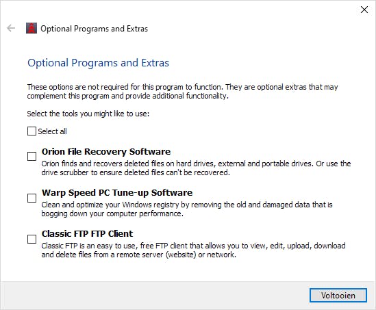 Onder het Help-menu kun je extra tools installeren via Install Optional Tools and Extras. Standaard staat daar al Express Burn van NCH Software aangevinkt, een programma voor Windows en Mac om optische schijven te branden. Voor wie nog in cd’s en dvd’s gelooft, is dit de manier om vanuit de back-uptool rechtstreeks schijven te branden. Er zit ook een ftp-client bij, Classic FTP, en een tool om de snelheid van je pc te verbeteren en het register te optimaliseren, waar we niet meteen warm voor lopen.
