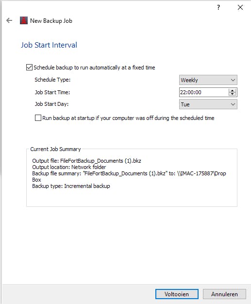 Je kunt de back-uptaak handmatig starten, maar vaak is het veiliger om deze te automatiseren volgens een vastgelegd schema. De zwakste schakel in het back-upmanagement blijft immers de gebruiker die soms slordig en vergeetachtig is. Het venster Job Start Interval regelt de planning van de back-ups. Wanneer je de optie Schedule backup to run automatically at fixed time selecteert, geef je aan of je de back-up dagelijks of wekelijks op een bepaald tijdstip laat uitvoeren. Je kunt ook automatisch een back-up laten maken bij het opstarten van het systeem als de pc binnen de ingeplande tijd wordt uitgeschakeld. Onder in dit venster verschijnt voor alle veiligheid nog een keer de samenvatting van alle instellingen die je hebt gemaakt, voordat je op de knop Voltooien klikt. Telkens wanneer een back-uptaak is afgewerkt, ontvang je een melding in het systeemvak van het Windows-bureaublad.