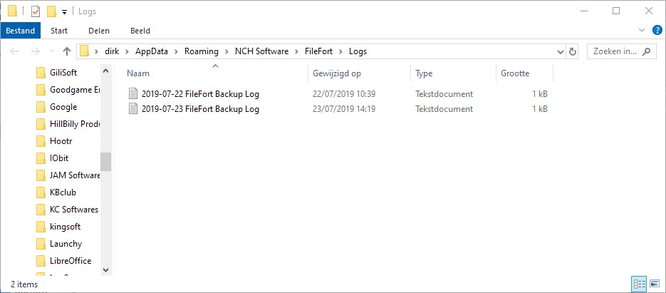 FileFort Backup houdt een logboek bij van alle back-ups die het heeft gemaakt. Dit logboek bestaat uit tekstbestanden die ieder slechts 1 KB groot zijn. Deze bestanden komen terecht in de map Gebruikersnaam / AppData / Roaming / NCH software / FileFort / Logs. In deze map kun je de oude logs ook regelmatig verwijderen. Je komt het snelst bij de logs via het programma zelf: FileFort / View Logs. In zo’n log lees je wanneer een taak is gestart en of die opdracht succesvol is uitgevoerd.