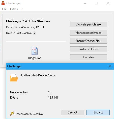 Je kunt nu de gewenste data versleutelen door de bestanden of zelfs een complete map naar het pictogram Drag&Drop op het hoofdvenster te verslepen. Daarna bevestig je met Encrypt. Gezien op dit moment kanaal (met Passphrase) A actief is, zal Challenger hiervoor automatisch het wachtwoord van dat kanaal gebruiken. De betrokken bestanden krijgen de extensie cha mee en anders dan bij AES Crypt worden meteen ook de originele data ‘gewipet’. Wil je cha-bestanden decrypteren, versleep die dan eveneens naar Drag&Drop, klik op Decrypt en vul het wachtwoord in als daarom wordt gevraagd.