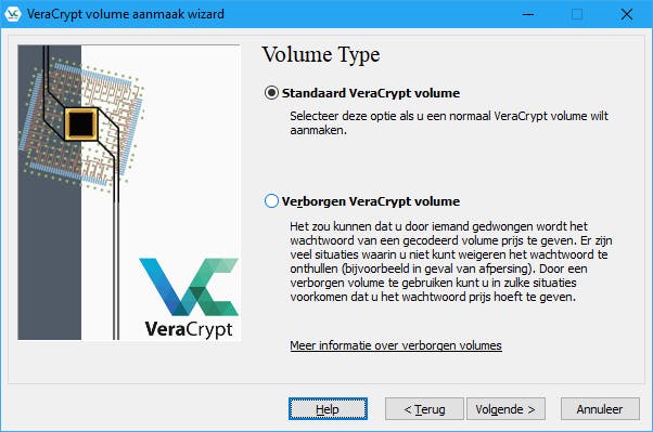 Na de installatie start je VeraCrypt op en druk je op de knop Maak volume. Selecteer vervolgens Codeer een niet-systeempartitie/station, druk op Volgende en kies Standaard VeraCrypt volume. Een andere mogelijkheid is nog een Verborgen VeraCrypt volume: dat is een volume dat zich geheel binnen een ander, niet-verborgen volume nestelt. Afhankelijk van het wachtwoord dat je opgeeft, zal VeraCrypt het buitenste, niet-verborgen volume koppelen, dan wel het binnenste, verborgen volume. Word je ooit gedwongen het wachtwoord prijs te geven, dan geef je natuurlijk alleen het wachtwoord van het buitenste volume prijs: dat bevat dummy- of niet-privacygevoelige data.