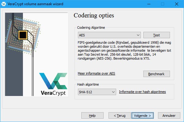 Wij kiezen hier voor een standaard volume. Een volgende stap is logischerwijze het aanduiden van het gewenste volume, dat overigens ook een usb-stick kan zijn. Selecteer na je bevestiging Aanmaken en formatteren gecodeerd volume. Houd er evenwel rekening mee dat eventuele bestaande bestanden worden overschreven met toevallig gegenereerde data! Zo nodig moet je die dus eerst naar een andere locatie veilig stellen en na het aanmaken van het volume terugzetten, zodat je gegevens alsnog worden versleuteld. Druk nogmaals op Volgende en laat gerust AES als Codering Algoritme geselecteerd – een combinatie van meerdere algoritmes is overigens ook mogelijk. Ook het Hash algoritme kun je rustig ingesteld laten op SHA-512. Druk alweer op Volgende (2x) en vul een complex wachtwoord in (2x). Kies Ja indien je bestanden groter dan 4 GB op dit volume wilt plaatsen, zodat VeraCrypt een aangepast bestandssysteem kan voorzien. In het volgende venster beweeg je enkele keren willekeurig met de muisaanwijzer. Eventueel plaats je een vinkje bij Snel formatteren waarna je op Formatteer klikt. Ben je zeker van je zaak, bevestig dan met Ja en wacht tot de formattering is voltooid.