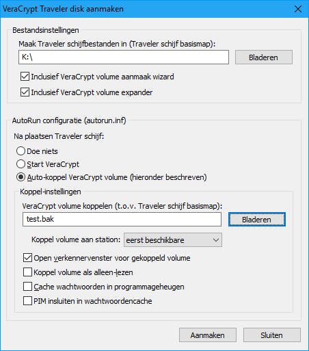 De stick dient ook nog enkele andere bestanden te bevatten. Zorg dat het volume op de stick is gekoppeld (zie tip 06), open het menu Tools en kies Traveler disk aanmaken. Verwijs naar (de rootmap van) de usb-stick met de knop Bladeren; eventueel vink je de optie Start VeraCrypt aan bij AutoRun configuratie – afhankelijk van de Windows-configuratie op het toestel zal VeraCrypt dan automatisch starten na het inpluggen van de stick. Bevestig met de knop Aanmaken en sluit het venster af. Houd er evenwel rekening mee dat je op het toestel waar je de stick inplugt over administratorrechten moet beschikken om met VeraCrypt in portable modus aan de slag te kunnen.