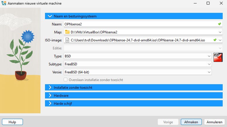 Installeer VirtualBox, start deze op en druk op de knop Nieuw. In het dialoogvenster geef je OPNsense op bij Naam, kies je een geschikte map (met voldoende opslagruimte) en verwijs je bij ISO-image naar het uitgepakte iso-bestand. Stel Type in op BSD, Subtype op FreeBSD, en Versie op FreeBSD (64-bit).