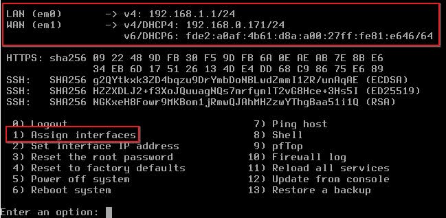 De WAN-toewijzing kan per systeem verschillen. Als er geen WAN is toegekend, kies dan menuoptie 1 (Assign interfaces). Beantwoord de vraag over LAGG’s (Link Aggregation Groups) en VLAN’s met N. Voer eventueel zelf de naam in van de nog niet toegewezen netwerkadapter (in ons voorbeeld em1). Je kunt dit proces altijd nog onderbreken en terugkeren naar het menu met Ctrl+C.