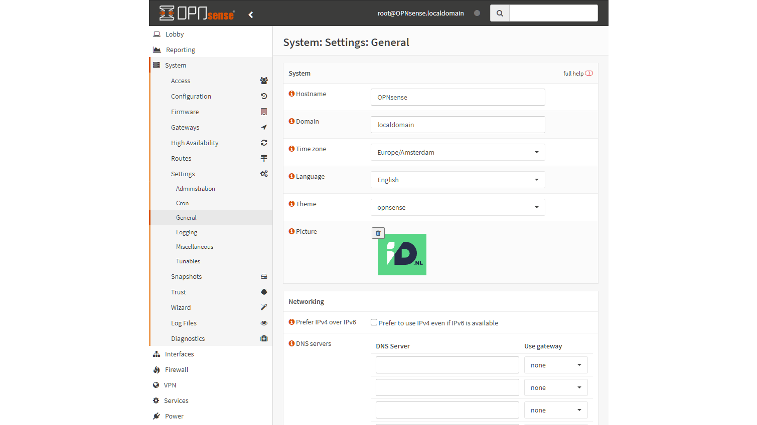 Voordat je de geavanceerdere functies van OPNsense verkent, is het verstandig enkele basisinstellingen te controleren. Ga naar System / Settings / General, waar je de Hostname (standaard OPNsense), Domain (standaard localdomain, eventueel vervangen door je eigen domeinnaam) en Time zone (bijvoorbeeld Europe/Amsterdam) kunt instellen. De optie Dutch is vooralsnog niet beschikbaar bij Language.