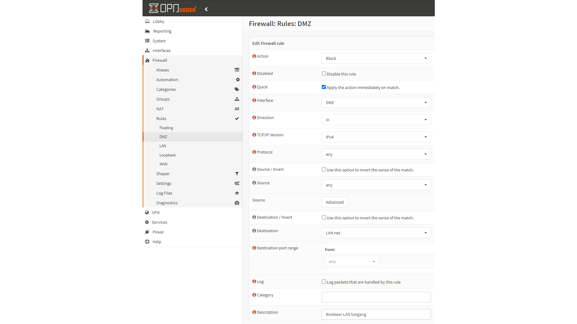 Wil je wel verkeer van de DMZ naar het internet toestaan, voeg dan een extra regel toe. Kies Pass als Action en DMZ als Interface. Stel Source in op DMZ net en Destination op WAN net. Vul een beschrijving in, bijvoorbeeld Toegang naar internet toelaten, en bewaar de regel.