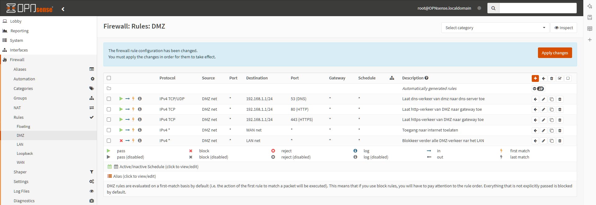Voor het toegankelijk maken van services op de DMZ vanaf het internet, ga je naar Firewall / NAT / Port Forward. Klik op Add, kies WAN als Interface en stel het juiste protocol in, bijvoorbeeld TCP/UDP. Selecteer WAN address bij Destination en stel bij Destination Port Range de poort(en) in die je wilt openstellen, bijvoorbeeld HTTP. Vul bij Redirect target IP het ip-adres in van het DMZ-netwerk dat het verkeer moet ontvangen. Indien nodig stel je bij Redirect target Port een alternatieve poort in voor de service (bijvoorbeeld (other), 8080). Bewaar de regel en bevestig ook hier met Apply changes.