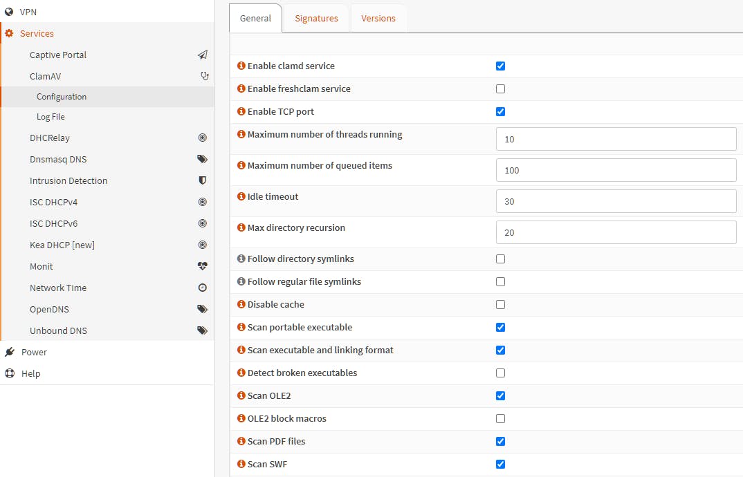 Na de installatie vind je ClamAV in de rubriek Services. Ga naar Configuration, klik op Download signatures en zorg dat Enable clamd service is ingeschakeld. Pas waar nodig de instellingen aan en klik op Save om de wijzigingen op te slaan.