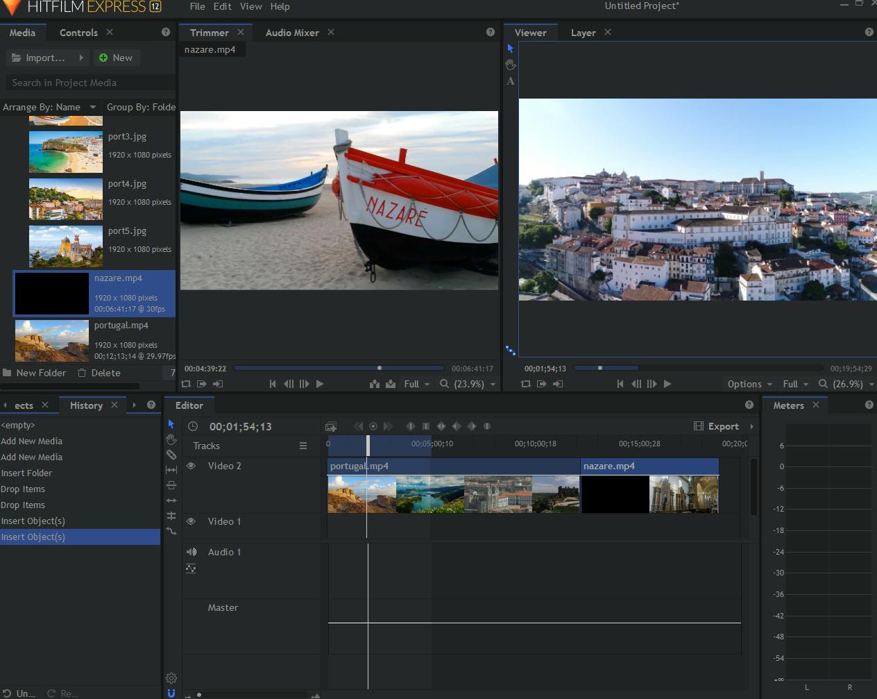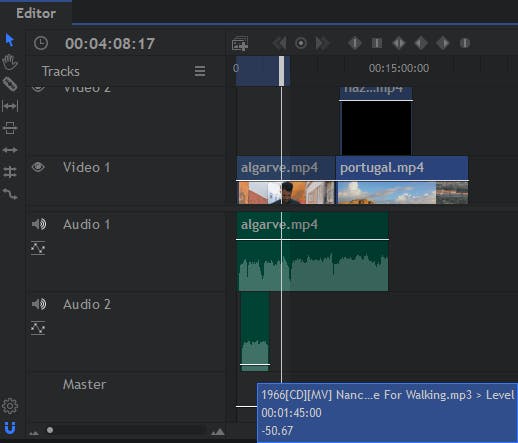 Het is trouwens ook mogelijk een clip naar het lege spoor bovenaan te verslepen. HFE creëert dan automatisch een extra videospoor (2e, 3e enzovoort) voor deze clips. Je zult merken dat de bijbehorende audio netjes op een afzonderlijk audiospoor terechtkomt.