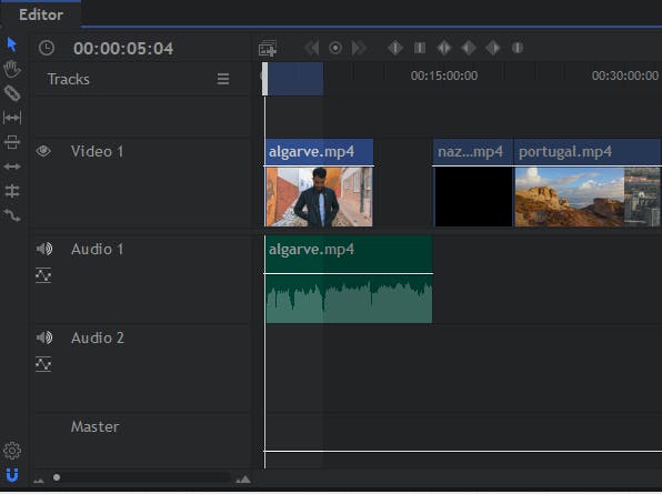 Rechtsonder merk je het eigenlijke Editor-paneel op, inclusief de obligate tijdlijn. Daarop tref je de sporen Video 1 en Audio 1 aan. Het is de bedoeling dat de beoogde media hier een plaats krijgen. Sleep om te beginnen een videoclip uit het Media-paneel naar het videospoor. Geef ook je andere videoclips een plekje in dit videospoor.