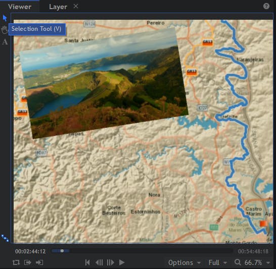 Selecteer om te beginnen het eerste spoor. In het Viewer-paneel, rechtsboven, merk je vier handvatten op aan de respectieve beeldhoeken en die kun je nu binnenwaarts slepen. Houd de Shift-toets ingedrukt om de beeldverhoudingen te bewaren. Dit miniatuurbeeld kun je vervolgens verplaatsen en roteren met behulp van het blauwe vierkantje.
