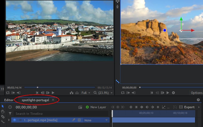 Klik met rechts op de clip, hetzij in het Media-paneel, hetzij op de tijdlijn, en kies Make Composite Shot. Voorzie een geschikte naam voor dit shot en bevestig met OK. Er opent zich nu een extra tabblad met bijbehorende tijdlijn (naast die van de standaard Editor). Omschakelen is een kwestie van op het gewenste tabblad te klikken.