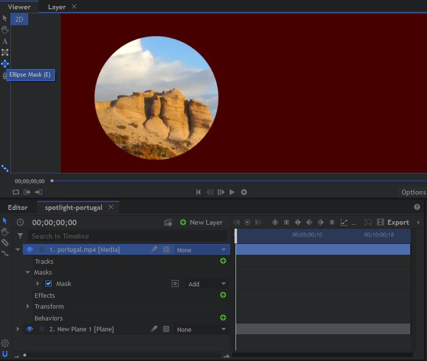 Het shot bestaat momenteel nog maar uit één laag. Daar voeg je nog een extra laag aan toe via New Layer / Plane (Ctrl+Alt+A). Stel Color in op de gewenste kleur voor je deklaag en bevestig met OK. Die laag sleep je nu zelf onder je originele laag zodat die niet langer je videobeeld bedekt. Selecteer vervolgens de laag met je videobeelden en druk op het knopje Ellipse mask, links van het Viewer-paneel. Met ingedrukte Shift-toets teken je hiermee een cirkelvorm op de voorbeeldweergave.