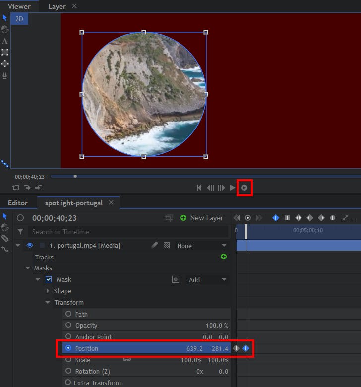 Om het spotlight over je beelden te laten bewegen open je in de laag het item Masks en selecteer je Transform. Klik het rondje bij Position aan zodat het blauw kleurt: je hebt hiermee een keyframe gecreëerd.