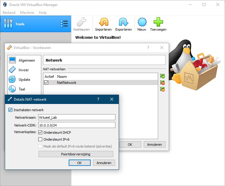 Download en installeer alvast VirtualBox. Start de tool op en kies Bestand / Voorkeuren / Netwerk. Druk op de knop Voeg NAT-netwerk toe en dubbelklik op het toegevoegde item. Eventueel pas je Netwerknaam en Netwerk CIDR (10.0.2.0/24) aan, maar zorg wel dat Inschakelen netwerk is aangevinkt. Bevestig met OK (2x).