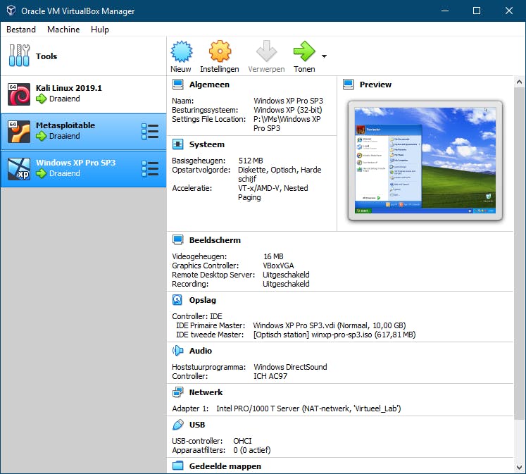 Laten we ook een paar (oudere) Windows-versies installeren. Voor Windows 7 en 10 kun je voor ova-appliances op de site van Microsoft terecht (bij Select platform kies je VirtualBox). Windows XP (SP3) kun je nog vinden op www.softlay.net, waar je Windows / Windows XP ISO selecteert. Omdat we deze targets zoveel mogelijk onbeschermd willen laten, kun je de automatische updatefunctie van Windows het best uitschakelen.