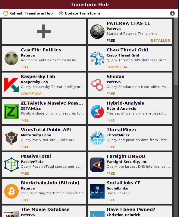 In het Transform Hub-venster tref je een reeks zogenoemde transforms aan: dat zijn processen die publieke data over het beoogde doelwit kunnen opvragen en deze data vervolgens naar een overzichtelijke informatiestructuur transformeren. De transform PATERVA CTAS CE is standaard al geïnstalleerd. Er zijn nog heel wat andere transforms die je kunt installeren, zoals Kaspersky Lab, VirusTotal Public API, Have I Been Pwned? enzovoort. De meeste vergen wel een token of API-sleutel, aan te vragen bij de respectieve producenten.