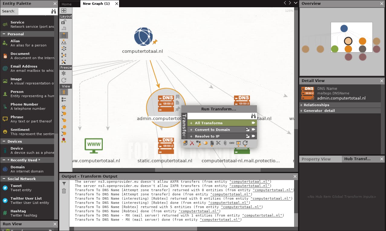 Zo vind je in de rubriek Infrastructure de Domain-functie terug: sleep die naar het nog lege canvas, dubbelklik hierop en vul de domeinnaam in die je wilt onderzoeken. Rechtsklik vervolgens op dit item en kies (bijvoorbeeld) DNS from Domain / Run All om de bijbehorende transforms uit te voeren. Het resultaat is een (ook grafisch) overzicht van zowat alle sites en servers die met dit domein te maken hebben. Rechtsklik op een subitem voor nog meer gedetailleerde informatie.
