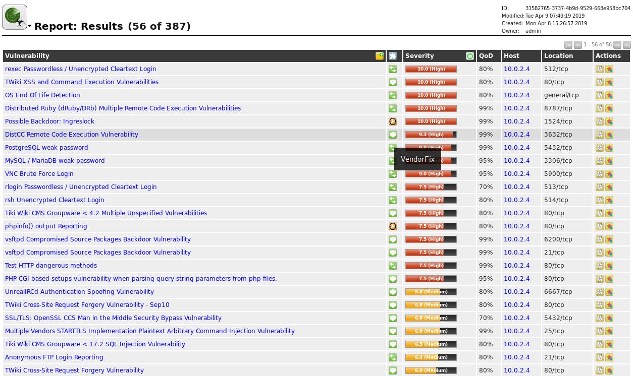 Op ons Metasploitable-toestel bleek het te gaan om 56 kwetsbaarheden, waarvan 3 Low, 36 Medium en 17 High. Voor een uitvoerig rapport klik je op de datum in de Date-kolom. Elke kwetsbaarheid wordt dan omschreven en je krijgt het getroffen poortnummer (Location) en een QoD-indicatie (Quality of Detection) te zien om de betrouwbaarheid van de detectie aan te geven. Nuttig is ook de kolom Solution type, met indicaties als VendorFix, Workaround, Mitigation (inperking) of in het slechtste geval WillNotFix. Je hoeft zo’n kwetsbaarheid maar aan te klikken om uitgebreide feedback te krijgen. Zo’n rapport laat zich trouwens ook naar diverse formaten exporteren, waaronder csv, html en pdf.