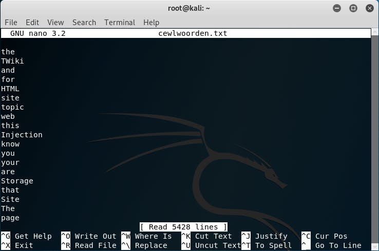 Hiermee extraheer je alle kandidaat-wachtwoorden tot vier linkniveaus diep, waarna die automatisch in het tekstbestand cewlwoorden.txt worden opgeslagen. Dit proces is behoorlijk arbeidsintensief, maar het laat zich altijd nog onderbreken met Ctrl+C. Je kunt het resultaat vervolgens bekijken met een opdracht als nano cewlwoorden.txt.