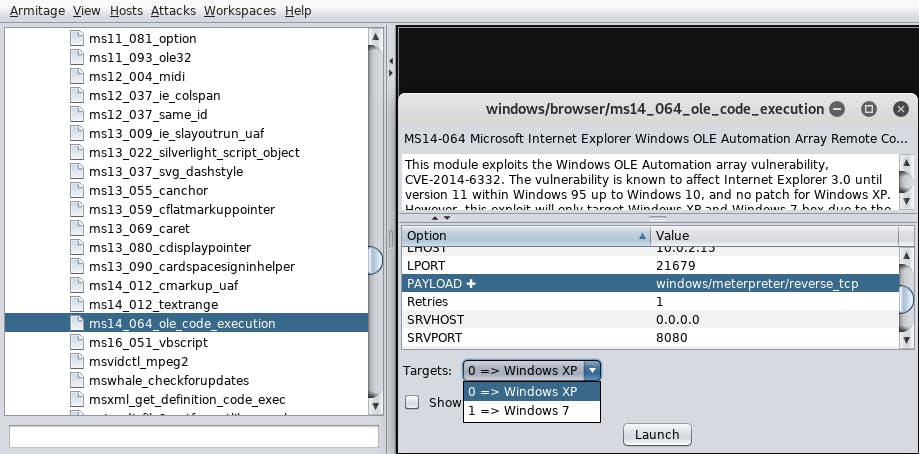 een exploit selecteren waarvan we weten dat die via een (verouderde) browser op een XP-toestel kan worden uitgevoerd. Klik op exploit / windows / browser en dubbelklik op ms14_064_ole_code_execution. Bevestig met Launch.
