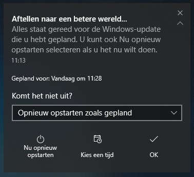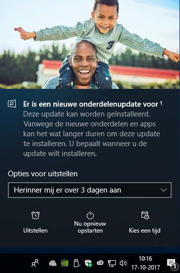 Wil je niet direct updaten naar de Fall Creators Update, dan heb je de mogelijkheid om hem uit te stellen. Onderaan de pop-up met de melding heb je een aantal keuzes: Uitstellen, Nu opnieuw opstarten en Kies een tijd.