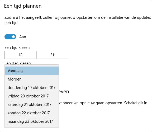 Je kunt de update naar Fall Creators Update pas echt uitstellen als je in de bovengenoemde pop-up op de knop Kies een tijd klikt. Het onderdeel Opties voor opnieuw opstarten wordt dan geopend, en dat is de centrale plek waarin je opgeeft wanneer de computer opnieuw mag worden opgestart bij een update. Microsoft heeft het hier over een tijd plannen, maar in feite is het niet echt een planning in de zin van dat je een periode opgeeft. Je kunt namelijk alleen maar een vast tijdstip en een dag opgeven. En dat laatste is slechts maar een paar dagen vooruit. Als je een tijd en een dag instelt, wordt de Fall Creators Update (en ook alle andere grote updates) op dat moment geïnstalleerd. Je computer wordt daarbij dan ook plotseling automatisch opnieuw opgestart (in het ergste geval) en in het positieve geval krijg je eerst netjes een melding.