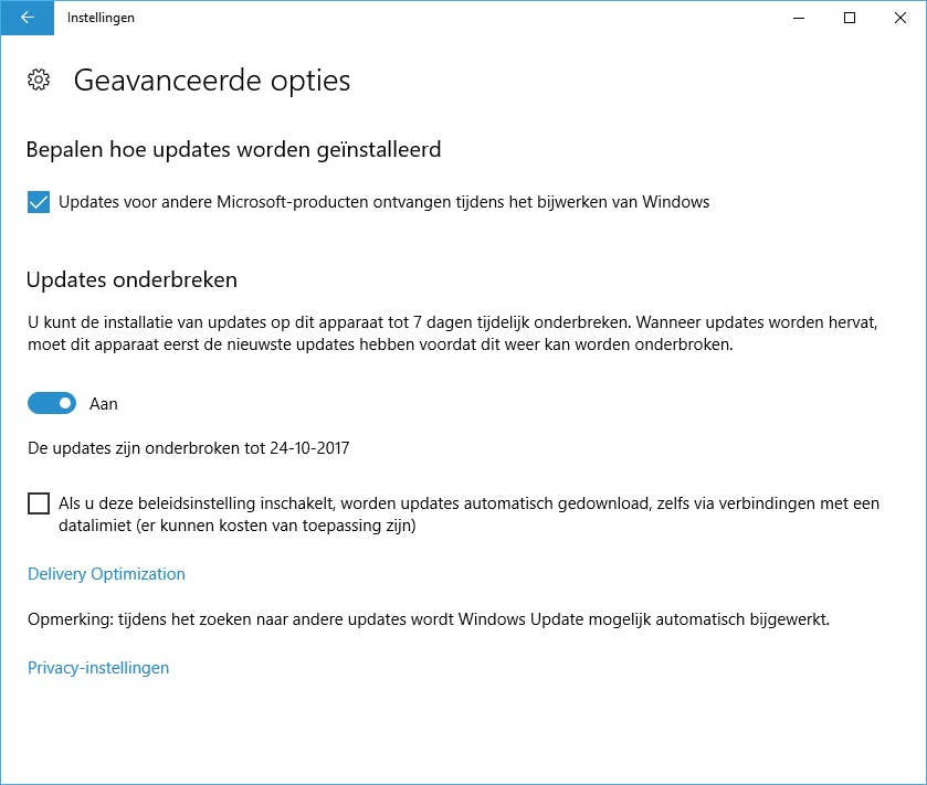 Vanuit de centrale updateinstellingen van Windows 10, te bereiken via Instellingen, Updaten en bijwerken, Windows Update en vervolgens Geavanceerde opties kun je opgeven dat je niet wilt dat er updates geïnstalleerd worden. Let wel: hier kun je geen einddatum opgeven, maar alleen een maximum van zeven dagen instellen. Na zeven dagen schakelt deze functie zich weer automatisch uit, als je dan even niet oplet wordt de update alsnog geïnstalleerd.